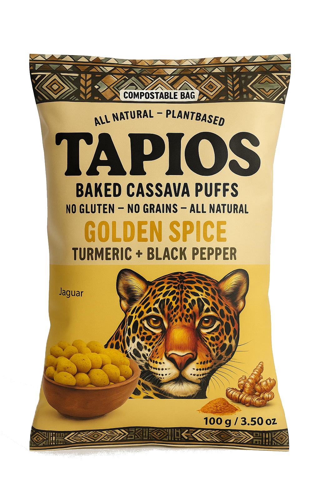 Our Golden Spice baked cassava puffs bring together the earthy, vibrant notes of turmeric with a gentle kick of black pepper — a combination celebrated for its taste and its benefits. Turmeric is renowned for its anti-inflammatory and antioxidant properties, and when paired with black pepper, its absorption is enhanced, letting you enjoy its full potential. These crunchy, plant-based puffs don’t just taste amazing — they nourish body and spirit, all while caring for the planet. Wrapped in a compostable bag, they’re a snack you can feel good about